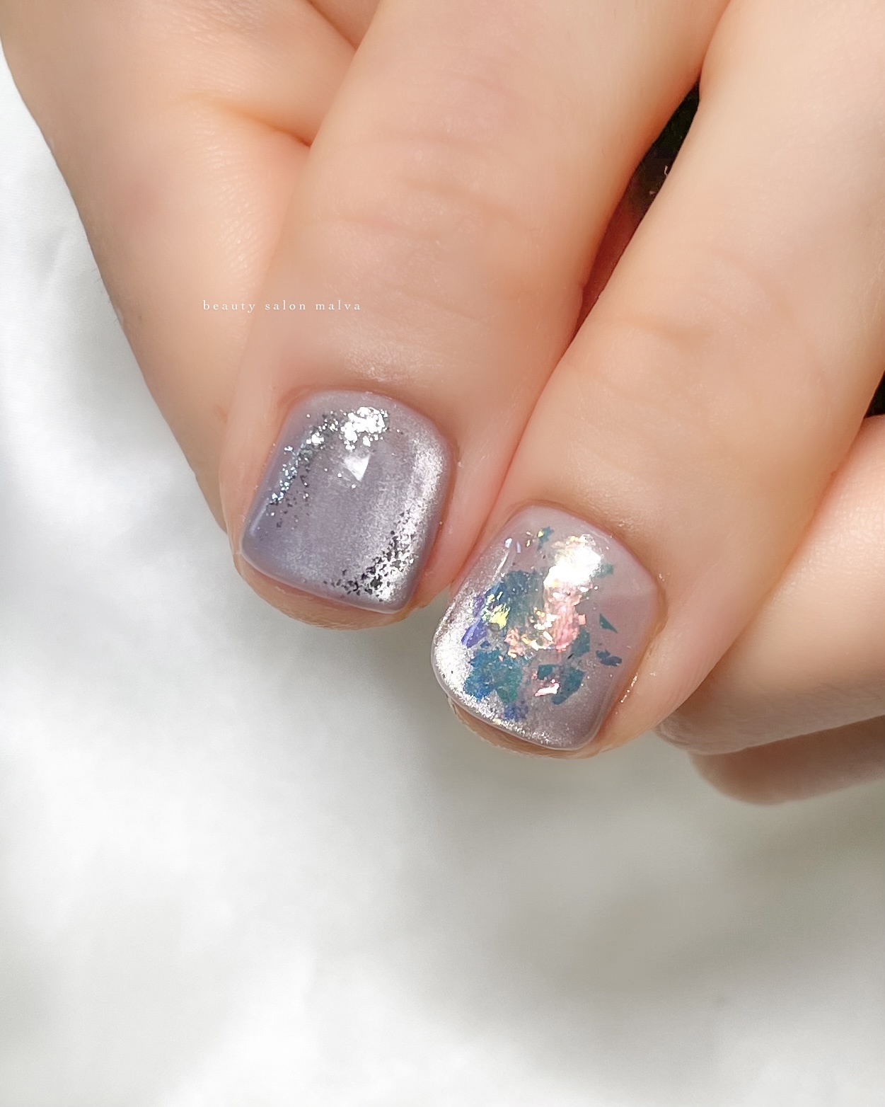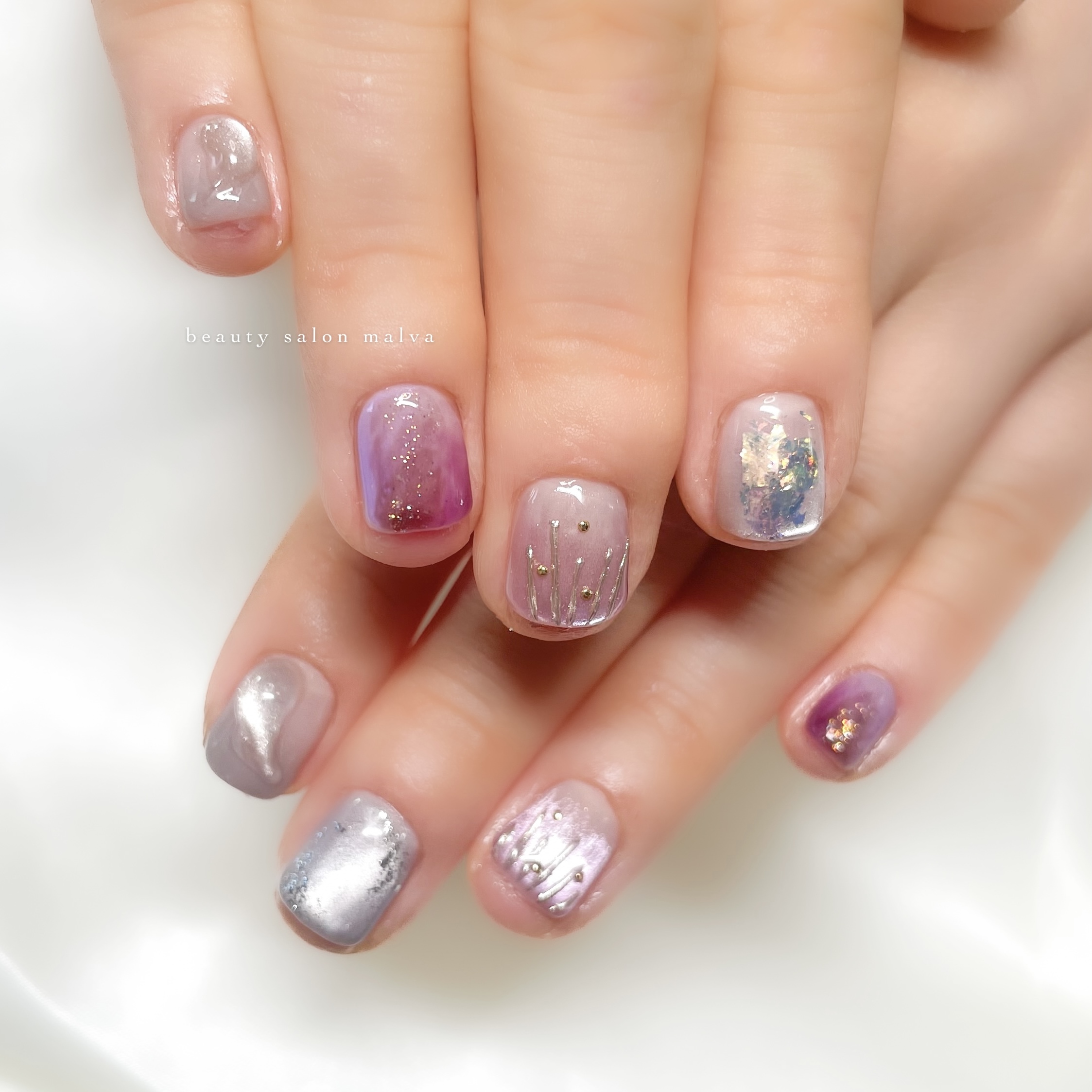 淡いパープルやグレイッシュなトーンをベースに、指先ごとに異なるニュアンスを加えることで、見る角度や光の当たり方によって雰囲気が変わります💅