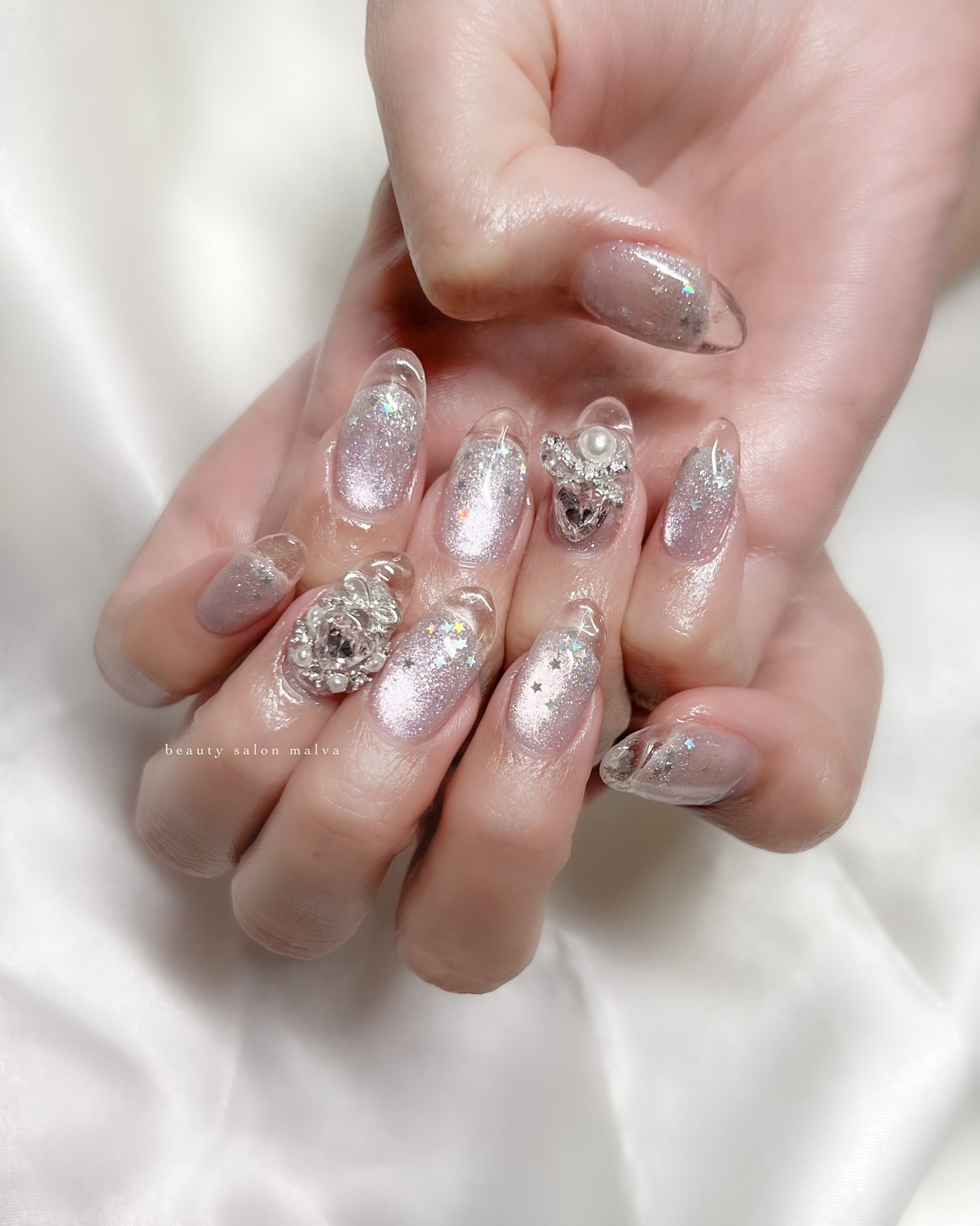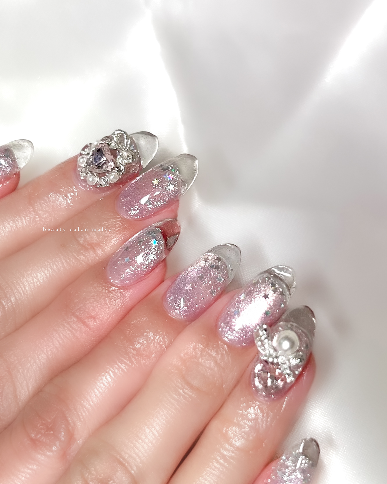 自爪で施術される場合は先端のクリアは無い状態となり、前面マグネットのキラキラとなります✨