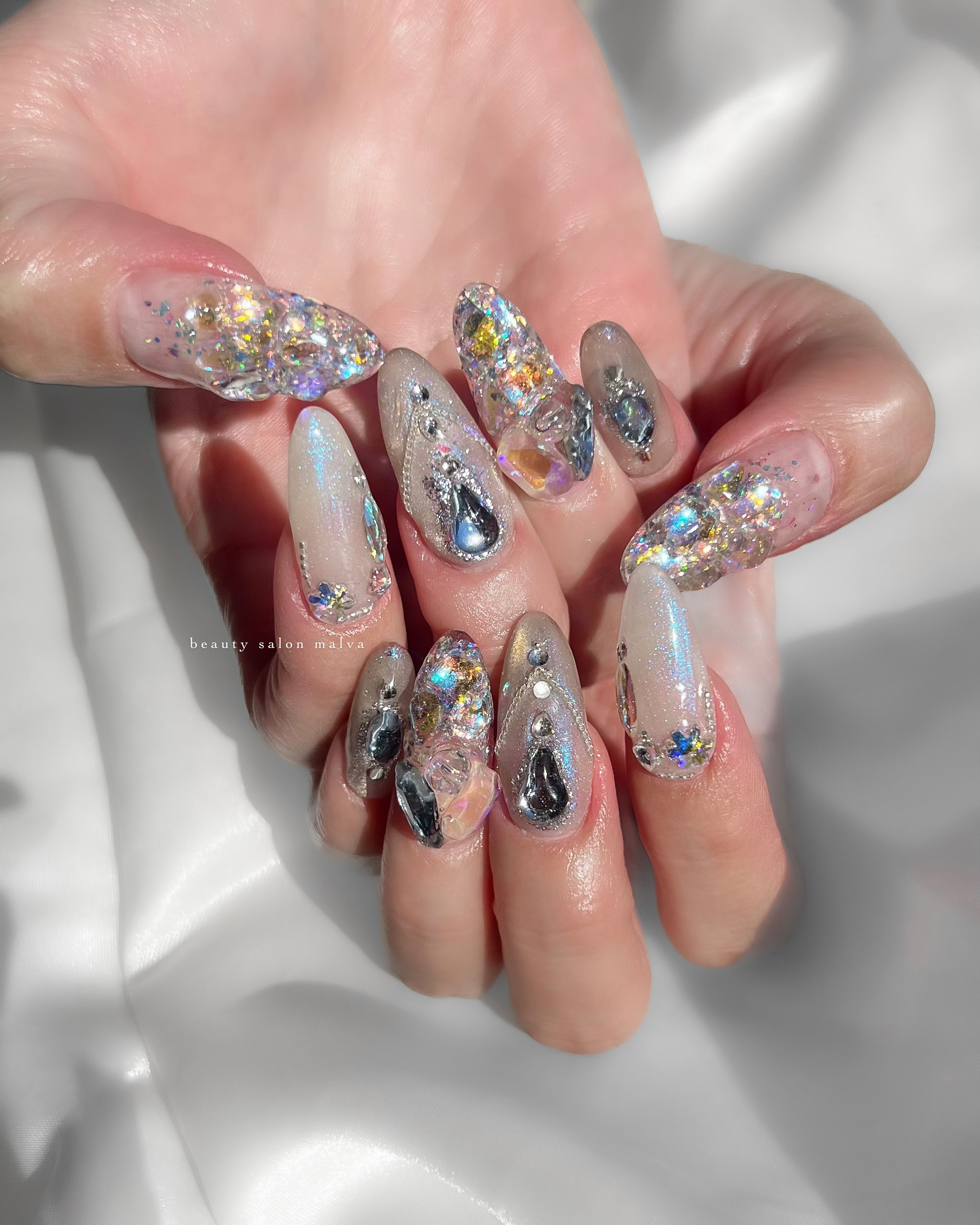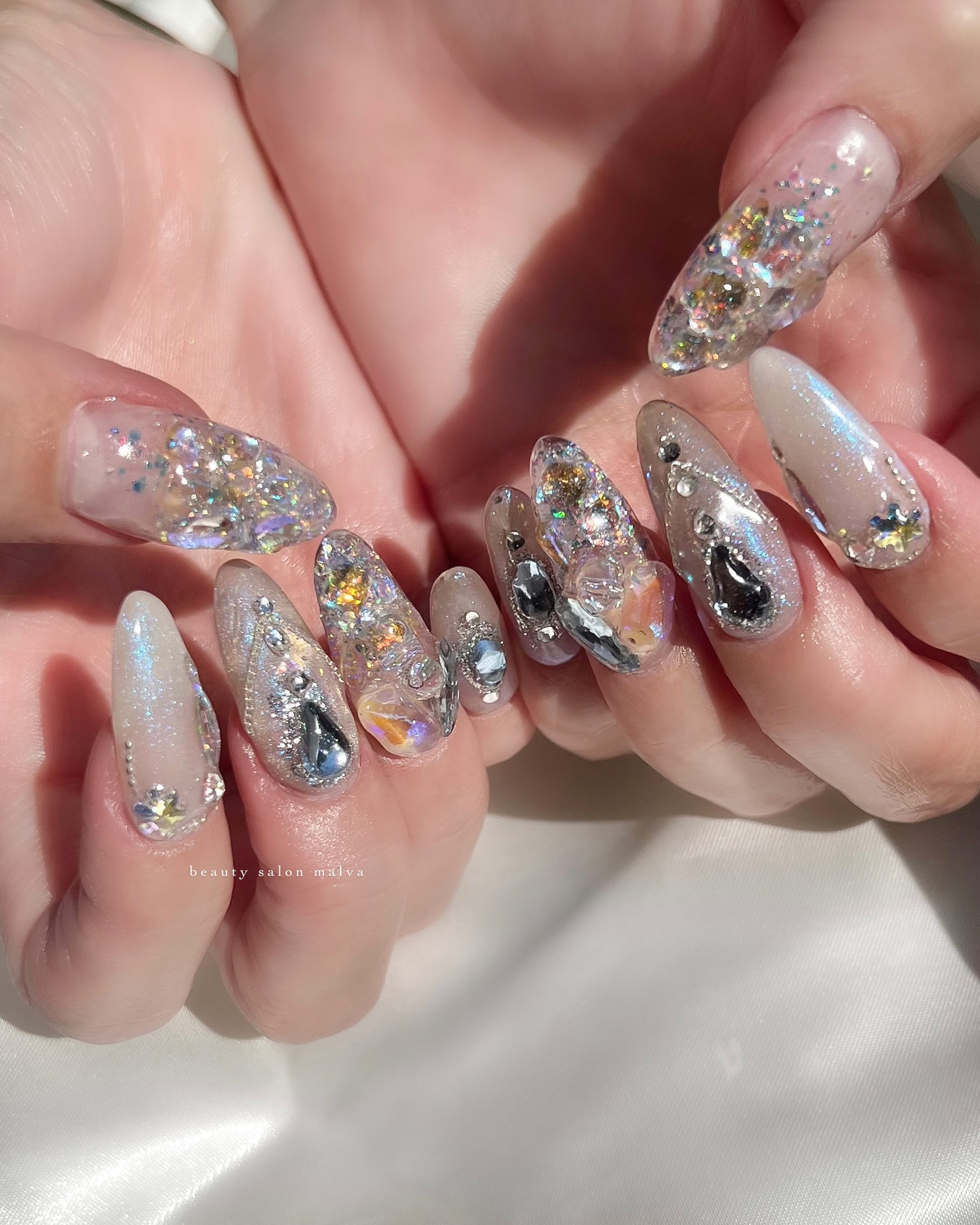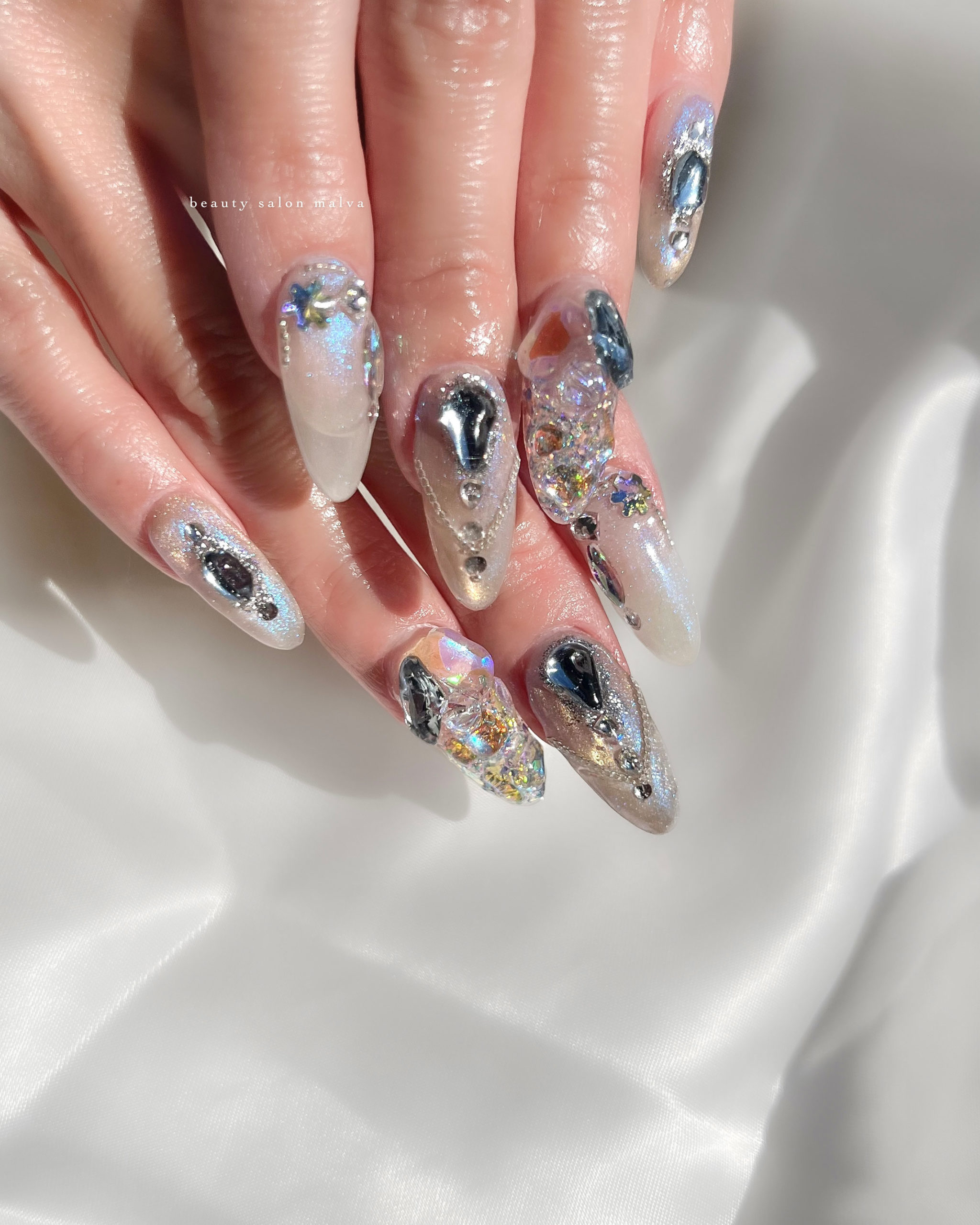 ストーンやパールをアクセサリー感覚で楽しめるので、イベントシーズンにも人気のスタイルです♪