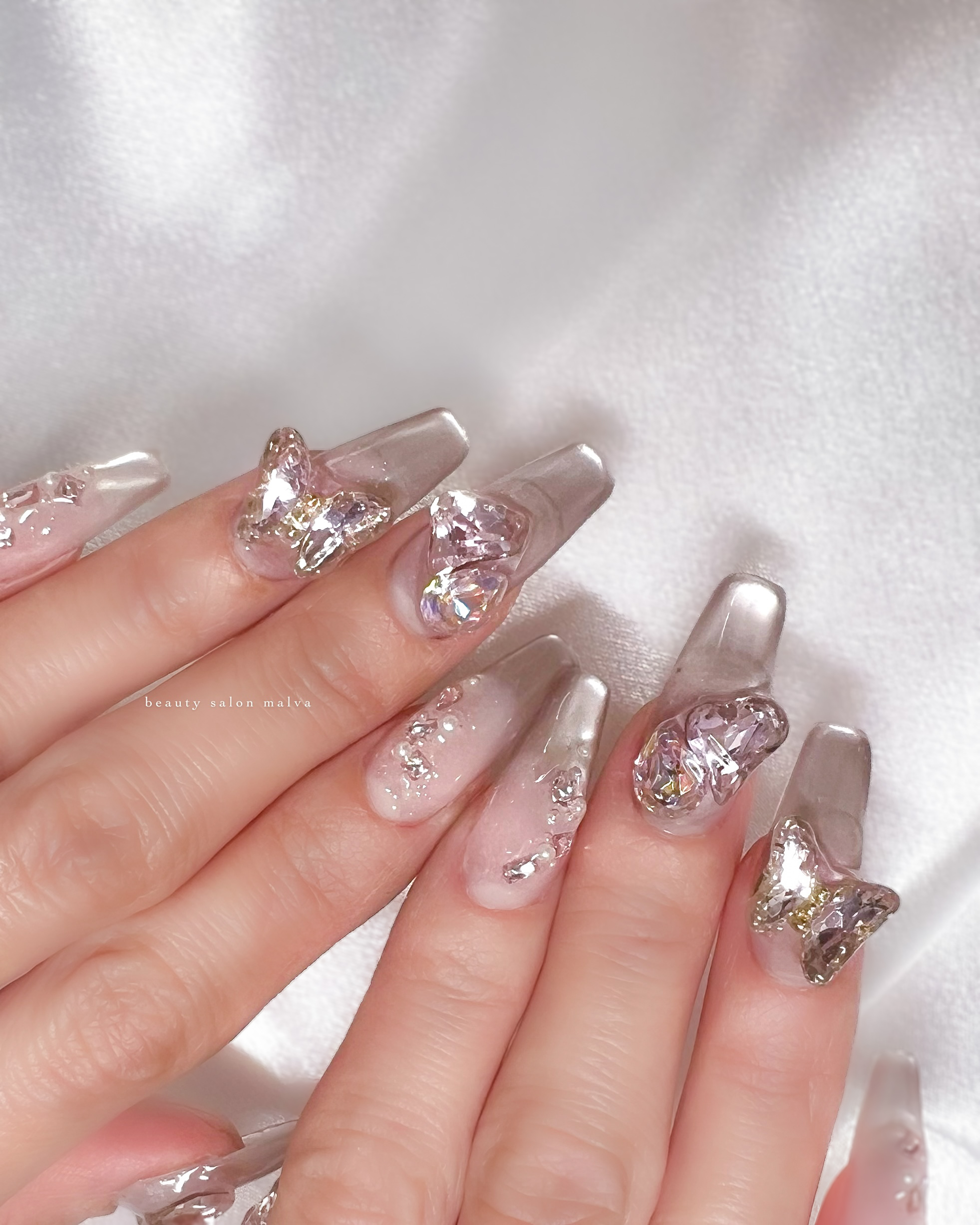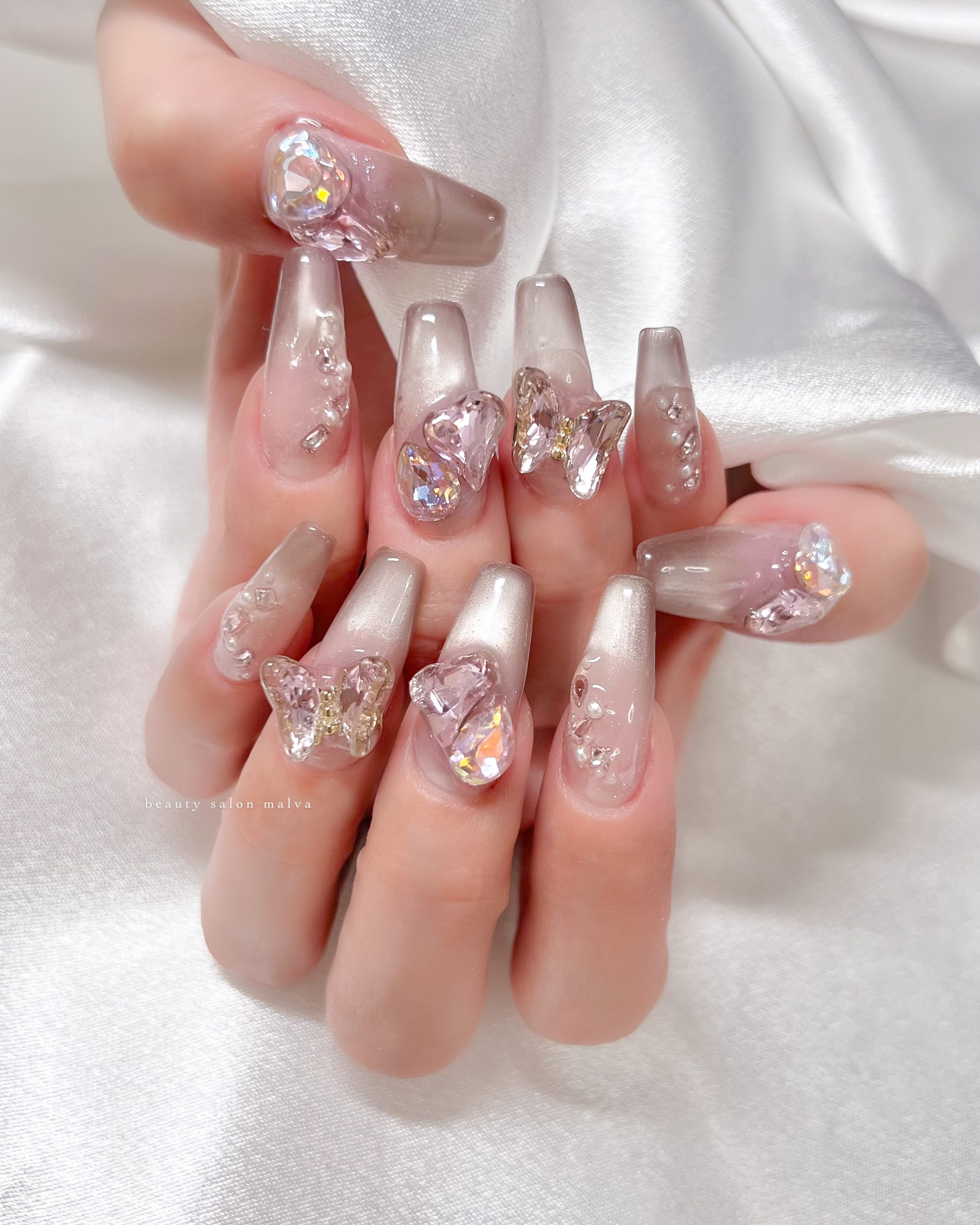 上にのせたストーンはすべてピンクで統一♡夜の光でもキラキラです✨